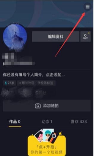 入抖音个人中心之后,点击右上角的按钮,如图所示。